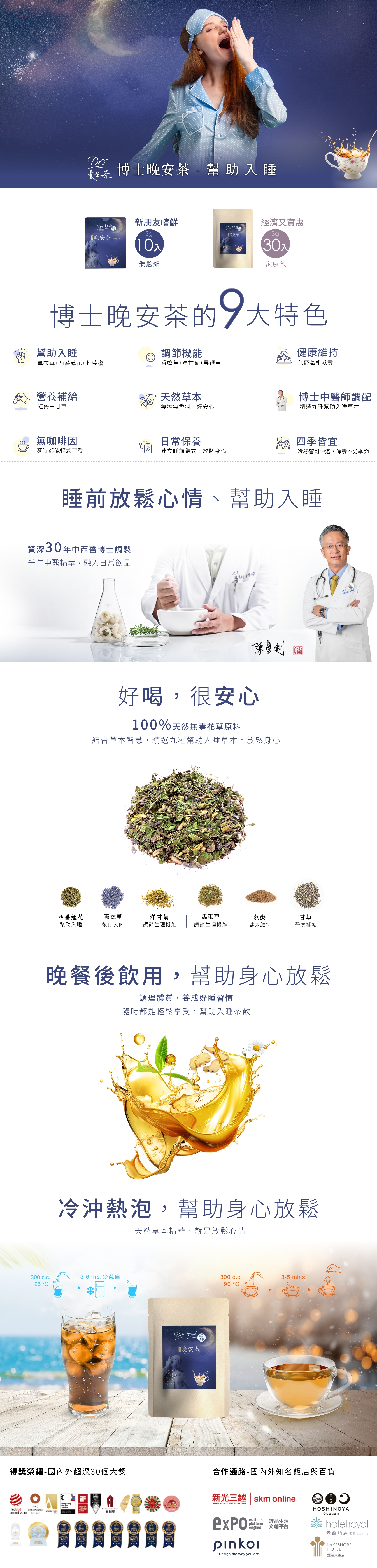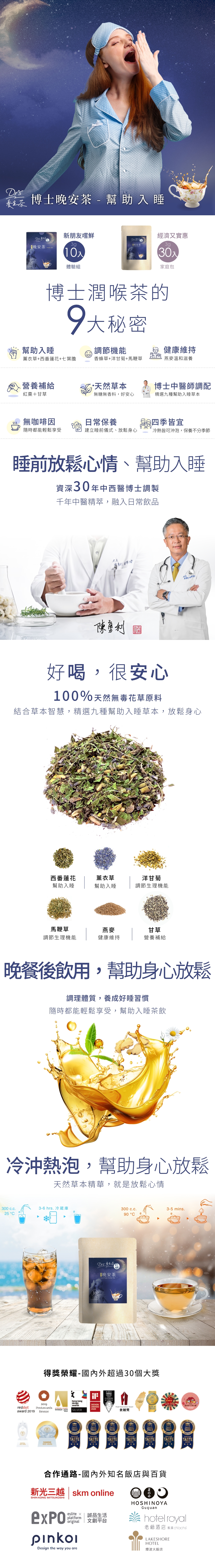 在腦袋停不下來或需要放鬆身心的夜晚,一杯溫和草本茶能幫助節奏慢下來。博士晚安茶由博士中醫師30年經驗調配,以馬鞭草為主,搭配洋甘菊與紅棗,主打幫助入睡與日常生理機能調整。全產品通過SGS檢驗,適合作為晚間放鬆、睡前飲用。臻品植萃累積超過30項國際大獎肯定。