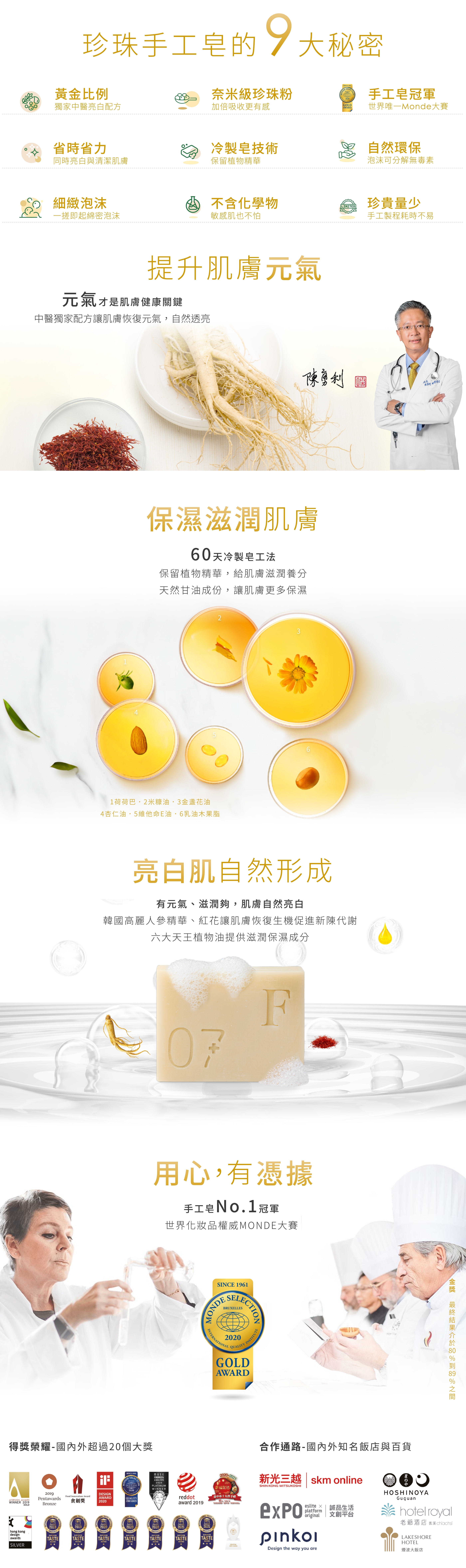 中醫獨家配方讓肌膚恢復元氣,奈米級珍珠粉,加倍吸收更有感!冷製皂技術保留植物精華,有元氣、滋潤夠,肌膚自然亮白。更是世界唯一 Monde大賽手工皂冠軍!