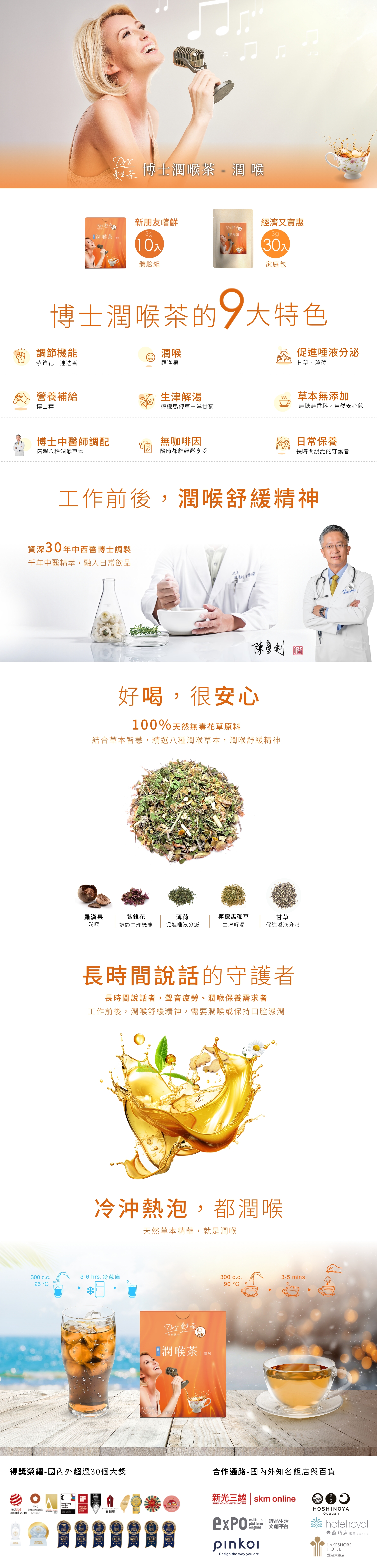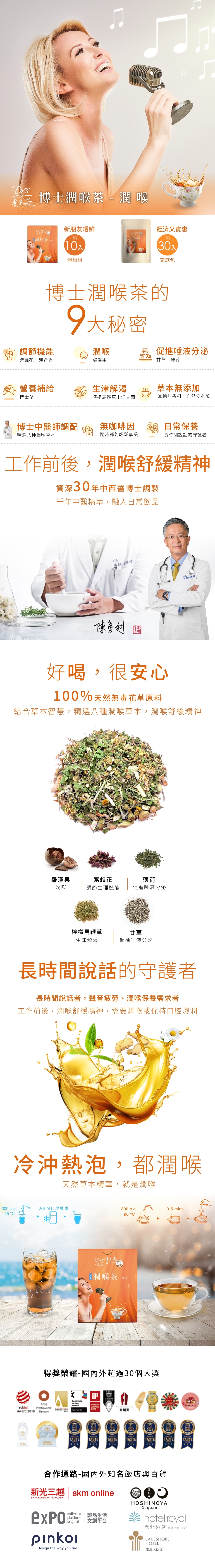 在聲音使用較多或需要清爽口感的日子裡,一杯帶有柔和草本香氣的茶飲能讓喉間更舒適。博士潤喉茶由博士中醫師30年經驗調配,以檸檬馬鞭草搭配羅漢果與紫錐花,主打潤喉與日常保養支持。全產品通過 SGS 檢驗,適合作為說話量大、工作間隙或午後緩和飲用。臻品植萃累積超過33項國際大獎肯定。