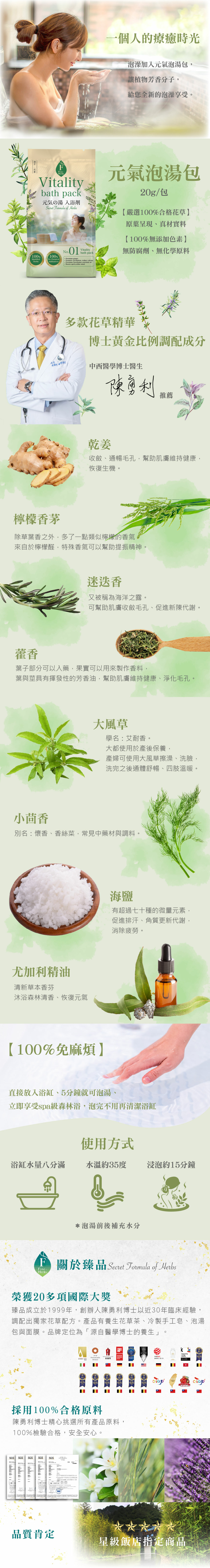 【注意事項】特殊疾病、懷孕、過敏、傷口、藥草不適、身體不適,請勿泡湯,若有疑慮請先洽詢醫師。*此產品為沐浴及外用,不可食用。